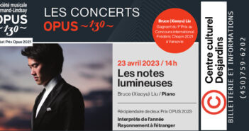 Sunday, April 23, 2023 @ 2:00 pm – 3:30 pm – 1er Prix au Concours international Frédéric Chopin à Varsovie en octobre 2021. Il est, depuis, très en demande un peu partout sur la planète et nous sommes privilégiés de le recevoir à Joliette pour un concert solo, LES NOTES LUMINEUSES, le dimanche 23 avril à 14h00 à la salle du Centre Culturel Desjardins. Musicien exceptionnel, […]