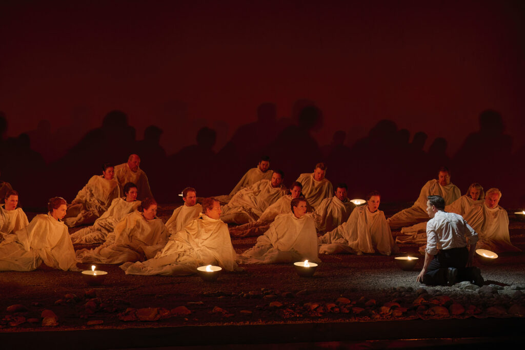 The minimalist aesthetic of Robert Carsen (director and lighting), Tobias Hoheisel (set and costumes) and Peter Van Praet (lighting) are effective in keeping Gluck’s original intentions of simplicity. The clever use of backlighting that casts shadows across the stage with much of the action seen in silhouette provides a vivid imagery of the underworld, even when the palette is dark with only flickering candles offering a touch of colour. The overall aesthetic invokes the inner thoughts of Orfeo who sings to nature and the gods, while externalizing the torment he experiences at the loss of his wife.