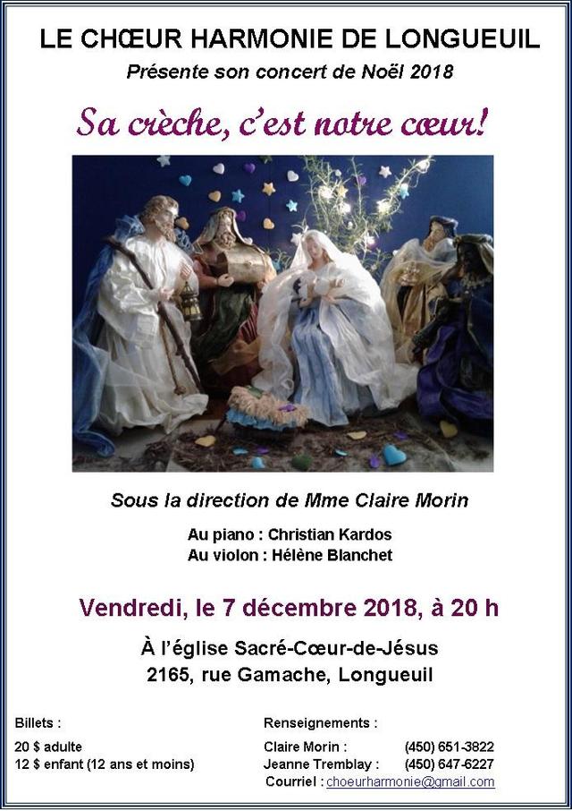 Pour ce concert de Noël, ayant comme thème “Sa crèche, c’est notre coeur”, le Choeur Harmonie de Longueuil, vous interprétera des airs tels: Le chant des anges, Happy Xmas, Les enfants oubliés, Noël blanc, St-Joseph qui lessive, Jesu Ueja, Alléluia (Mozart) et bien d’autres qui, nous sommes certains, sauront vous plaire. Offrez-vous ce plaisir en venant écouter tous ces beaux airs qui vous mettront dans l’ambiance du temps des Fêtes ! C’est une promesse !