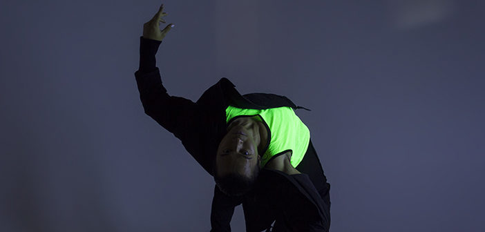 Une scène sombre, des costumes éclatants de couleurs néon. Comment trianguler le sens du timing entre l’individualité, la musicalité et la gravité? Plusieurs traditions se côtoient afin d’offrir aux interprètes différents langages corporels. Arts martiaux, danses urbaines, boxe… tout est prétexte à lutter contre la chute et retarder la rencontre avec le sol. La chorégraphie se compose à travers des variations dans l’amplitude des mouvements, la durée des séquences et le nombre de répétitions. Les solos s’enchainent aux interactions et le spectateur est témoin de l’éternel balancement entre la rationalité et l’animalité humaines.