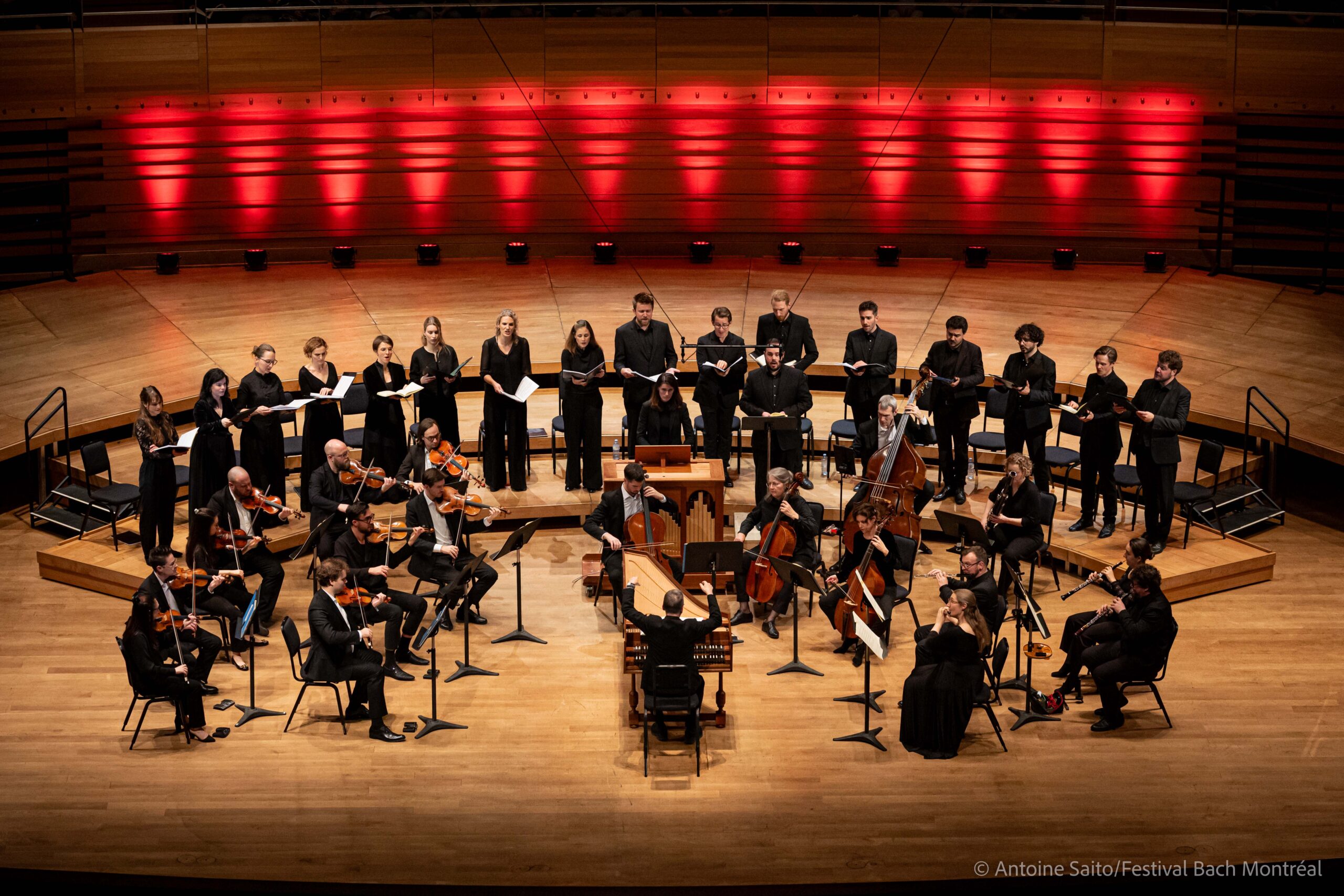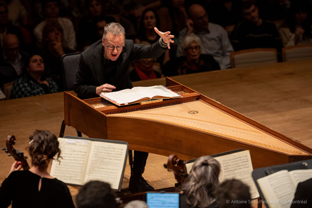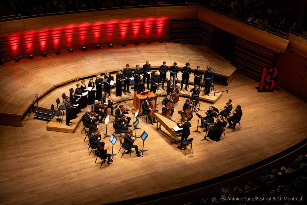 Après 3 semaines de concerts intensives, l’édition 2025 du Festival international Bach Montréal s’achevait officiellement le 7 décembre dernier, à la Maison symphonique, par le second concert – en deux soirs d’affilée – de Rudolf Lutz et du chœur de la Fondation Bach de Saint-Gall. Le chef et claveciniste suisse, joint pour l’occasion par l’orchestre du festival, dirigeait depuis son siège d’interprète, dos au public, la Passion selon Saint Jean du compositeur allemand.