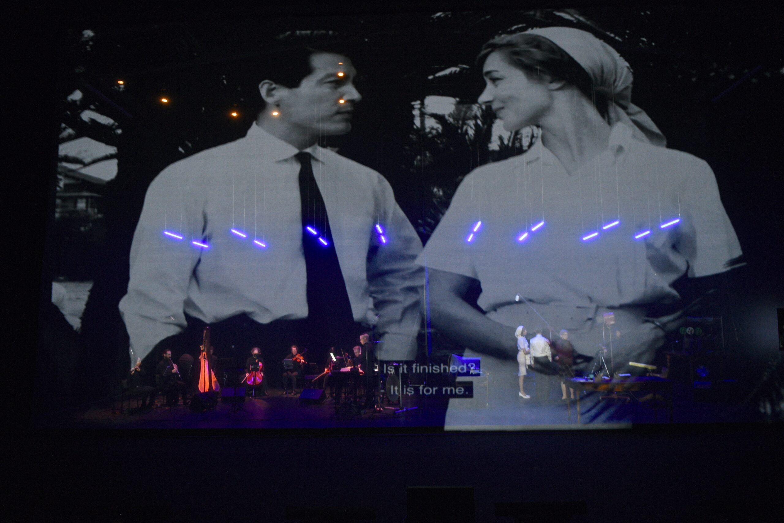 Plus de 400 photos tirées du film Hiroshima mon amour sont projetées sur l’écran qui traverse la scène. Crédit photo: Valérie Remise