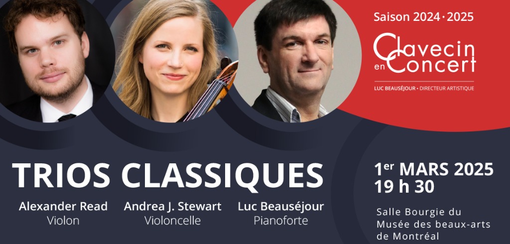 Montréal, le 5 février 2025. Clavecin en concert a le plaisir d’annoncer le premier concert de l’année 2025 consacré aux Trios classiques avec des œuvres de Johann Christian Bach, Franz Joseph Haydn et Wolfgang Amadeus Mozart. À côté de la symphonie, du quatuor à cordes et de la sonate pour clavier, le trio pour violon, violoncelle et clavier reste un des genres majeurs du classicisme.