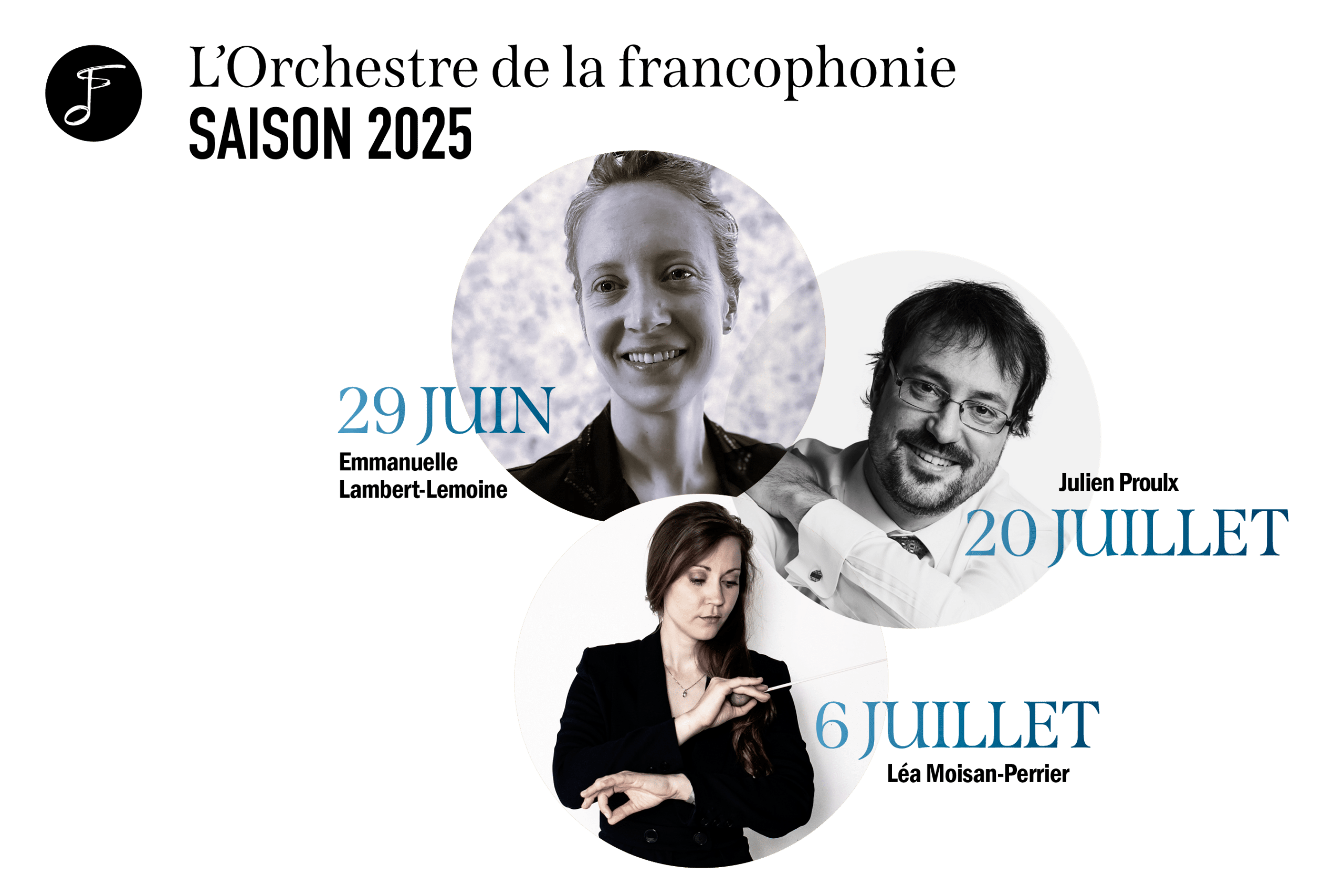 Montréal, le 26 mai 2025 — Dès ce dimanche 29 juin à 14h30 à la Salle Pierre-Mercure, l’Orchestre de la francophonie (OF) propose une programmation inédite, conçue autour d’un concours public visant à désigner sa prochaine direction artistique. En effet, le public aura le privilège de découvrir l’univers des trois chefs d’orchestre finalistes à travers une série de quatre concerts, menant à la désignation de la future direction artistique de l’OF au terme du grand concert final qui se tiendra à la Maison symphonique le 3 août. Emmanuelle Lambert-Lemoine, Léa Moisan-Perrier et Julien Proulx se disputeront les honneurs.