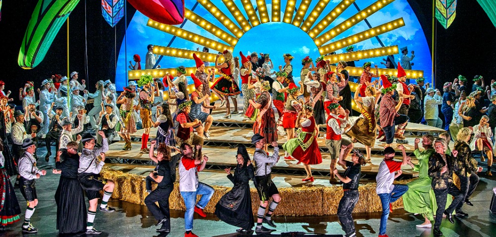 Visually, this was a handsome presentation in Andrew D. Edwards’ monumental sets which included a vertiginous church atop what looked like 100 stairs in Act 1, and stylized half-timbred facades in Act 2. The latter were brightly-coloured in candy store colours giving off a technicolour, Disney Babes in Toyland aesthetic. Susanne Hubrich’s costumes were eclectic, evoking small town 1960s with loud patterns and colours and yet, the churchgoers exiting in Act 1 were straight out of the 19th century.