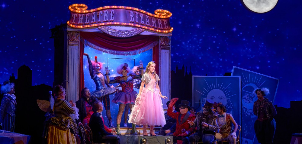 The action opens on a circus scene with a troupe of stylized clown dancers and the entire chorus dressed like circus performers. Juliette sings her famous waltz on a stage within the stage emblazoned with the moniker, “Théâtre bizarre.” It appears the action has been transferred to a big top environment, at least for Act 1. The circus setting never appears again, and it’s reasonable to ask why not? Its inclusion was puzzling, and seemingly random, given how little it did to enlighten our understanding of the piece.