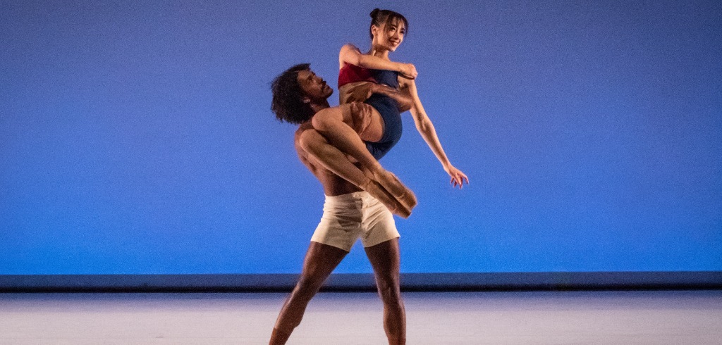 In Stay (2015), James partnered Petersen (formerly with American Ballet Theatre and the Australian Ballet). The eight-minute piece, set to music by Ólafur Arnalds and Nils Frahm, opens with a slow thrum of sound that establishes the moody tone. So do the cool grey-blue costumes—trousers for the once more bare-chested James; long-sleeved top and briefs, and pointe shoes, for Petersen. Her easy leaps onto his sturdy shoulder; his hand lingering down her leg; his swoons to the floor; her guiding him up: these were some of the quiet moments that brought hints of emotion to the choreography.