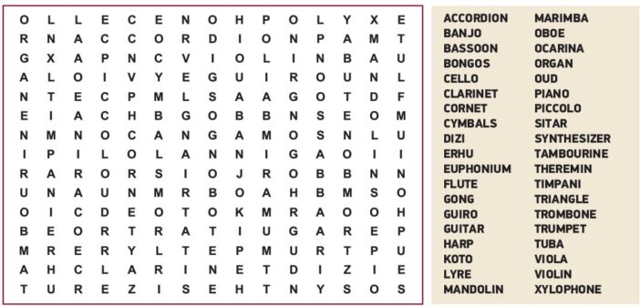 NOTE: The LSM October 2025 issue features two different and separate Word Search puzzles for the Instruments theme. Because some instrument names differ between English and French, two puzzles with different solutions were created.