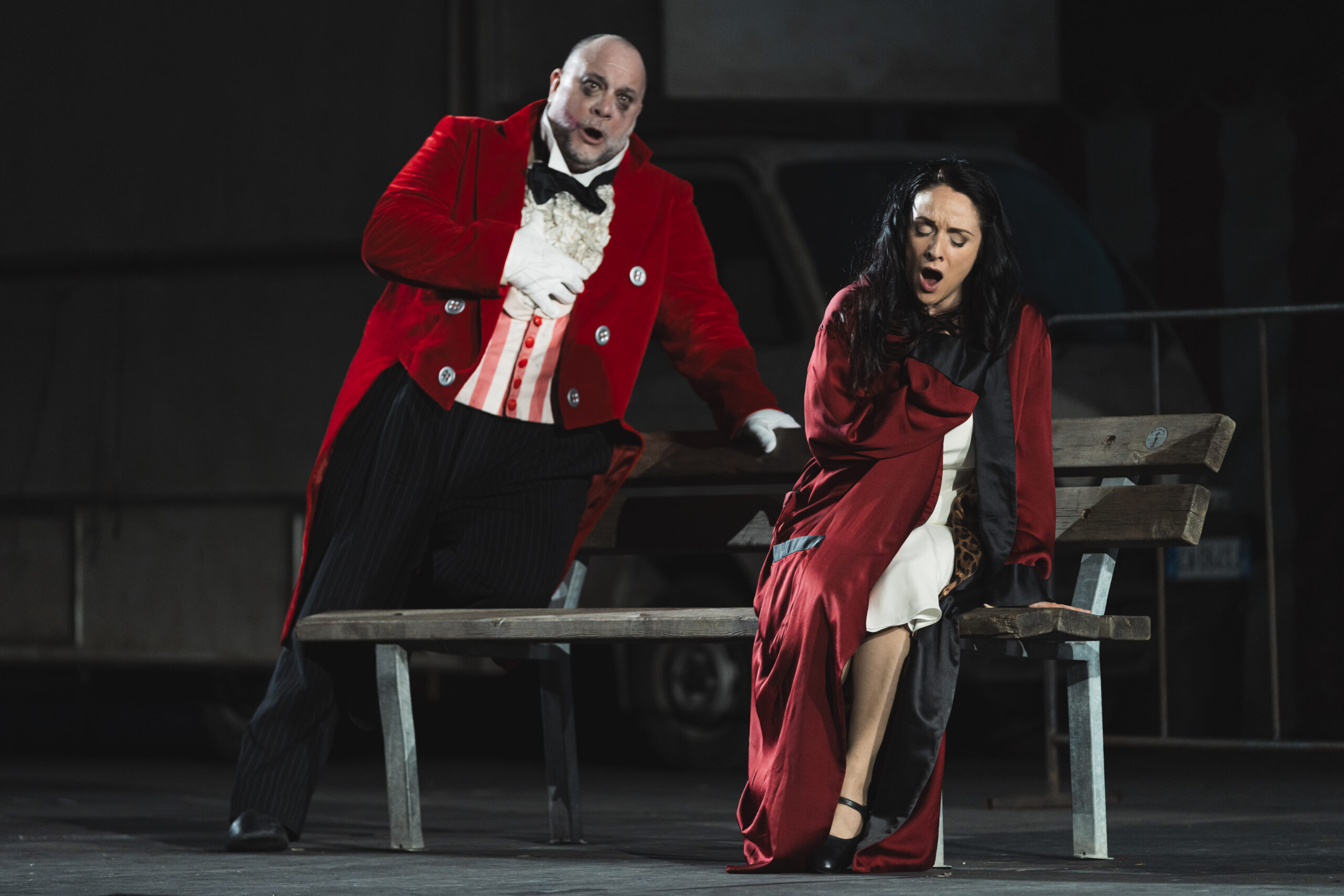 In Italian director Federico Grazzini’s staging of Rigoletto, the Duke of Mantua is downgraded to mafia capo, and the setting, to Tony Soprano’s New Jersey. The elegant palazzo ducale is now a seedy entertainment park. Rigoletto is no longer a court jester, but rather the park’s clown, who locks up his daughter Gilda in his caravan wagon.
