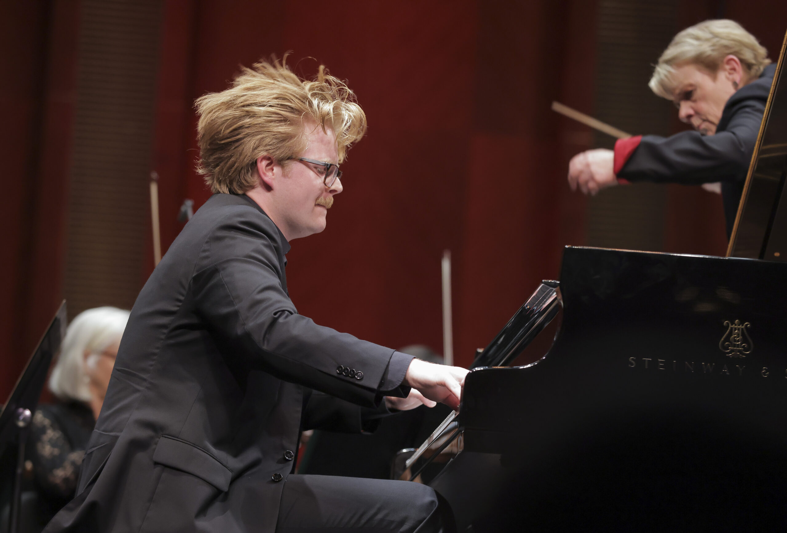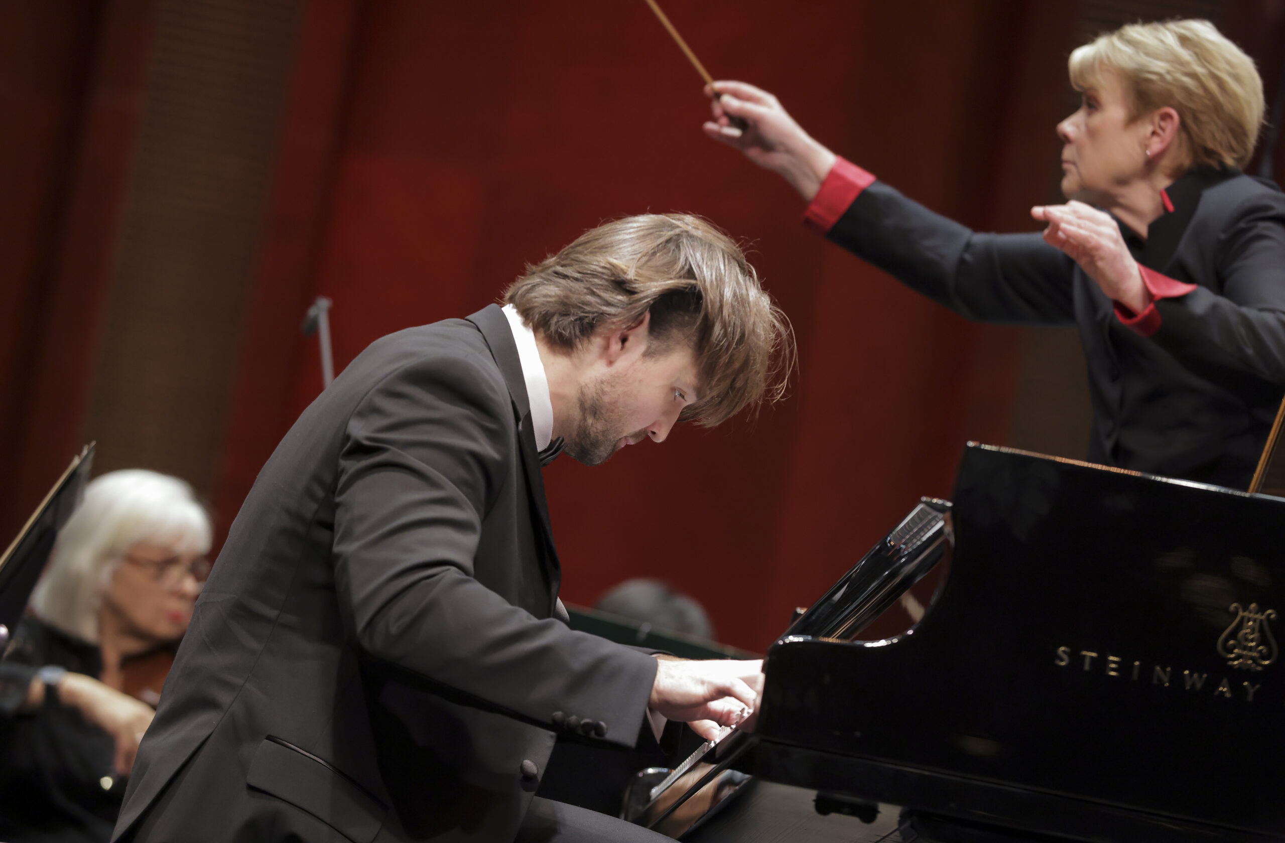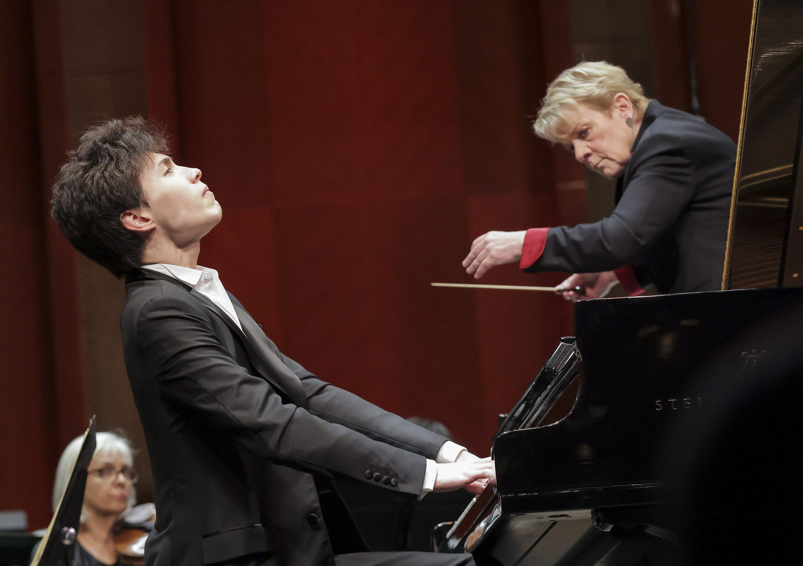 Philipp Lynov with Conductor Marin Alsop and the Fort Worth Symphony in the Finals of the Seventeenth Van Cliburn International Piano Competition. Photo: Ralph Lauer