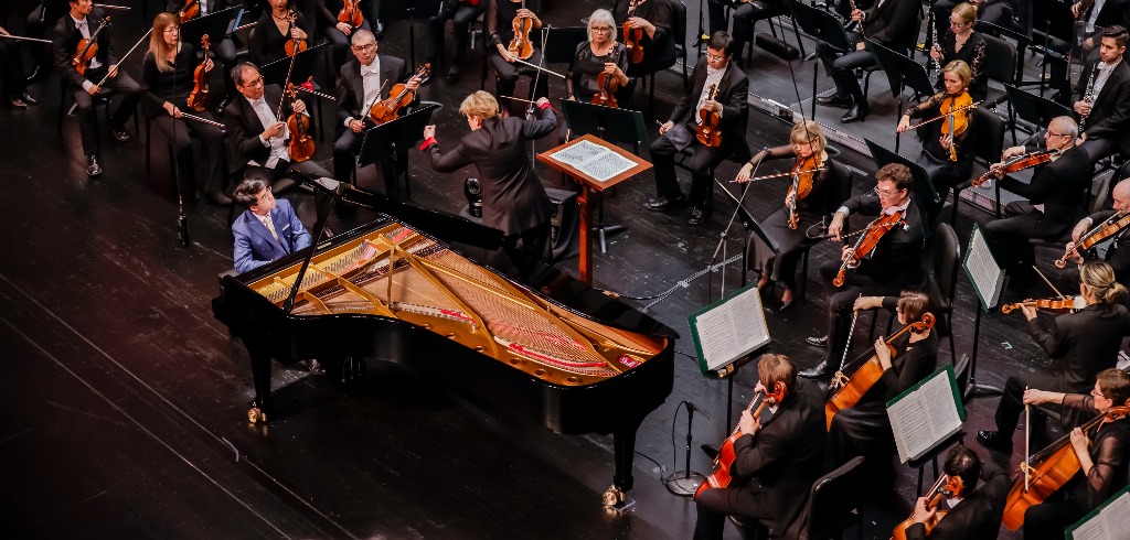 Evren Ozel with Conductor Marin Alsop and the Fort Worth Symphony in the finals of the Seventeenth Van Cliburn International Piano Competition. Photo: Ralph Lauer