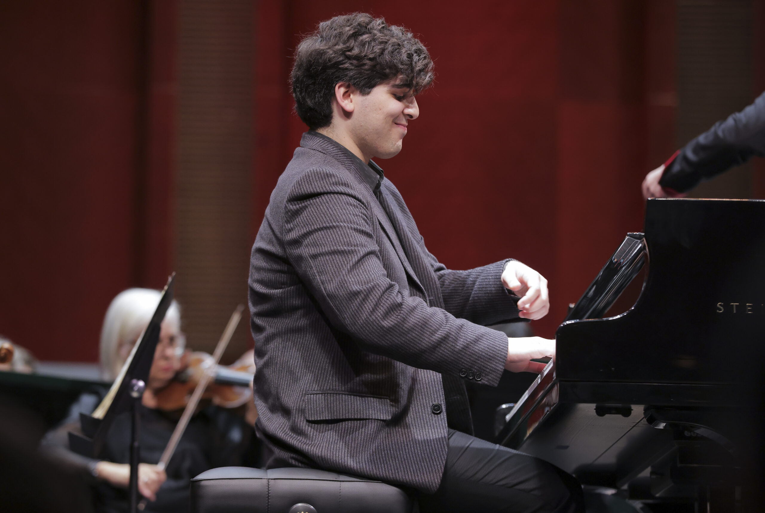 Vitaly Starikov with Conductor Marin Alsop and the Fort Worth Symphony in the finals of the Seventeenth Van Cliburn International Piano Competition. Photo: Ralph Lauer
